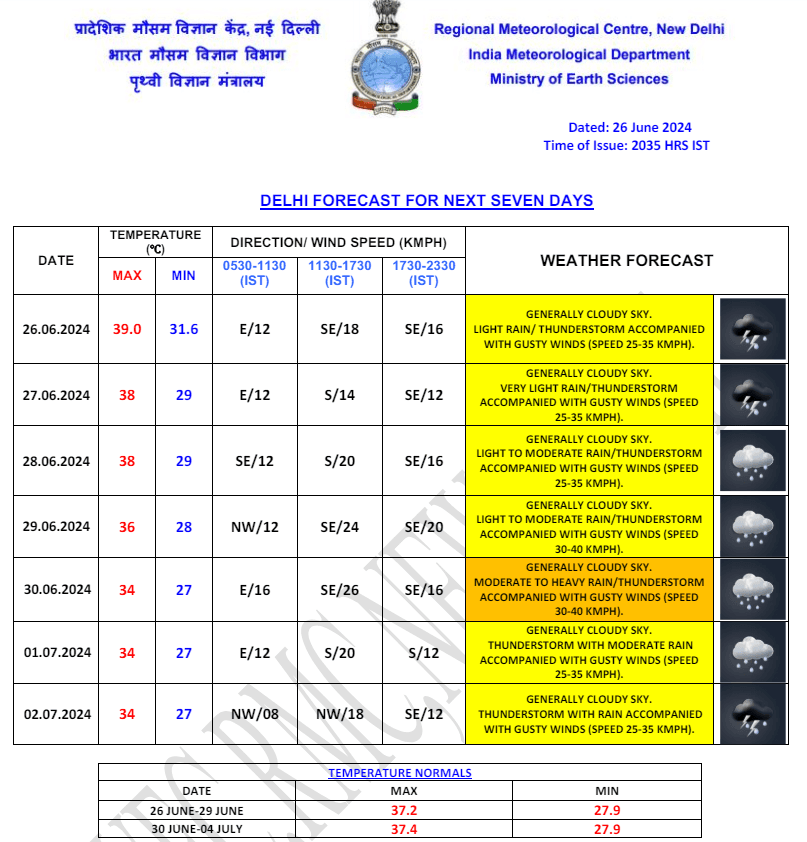 मौसम विभाग की ओर से जारी पूर्वानुमान में कहा गया है कि, अगले कुछ दिनों में दिल्ली का अधिकतम तापमान 34 डिग्री सेल्सियस तक गिर जाएगा जिससे लोगों को और राहत मिलेगी. वर्तमान में पश्चिमी विक्षोभ के कारण अधिकतम तापमान 40 डिग्री सेल्सियस से नीचे रिकॉर्ड किया जा रहा है. मौसम विभाग के अनुसार गुरुवार को सामान्यतः आसमान में बादल छाए रहेंगे. हल्की बारिश और गरज के साथ बौछारें पड़ सकती है. यहां का अधिकतम और न्यूनतम तापमान क्रमश: 38 और 29 डिग्री सेल्सियस के आसपास रह सकता है.