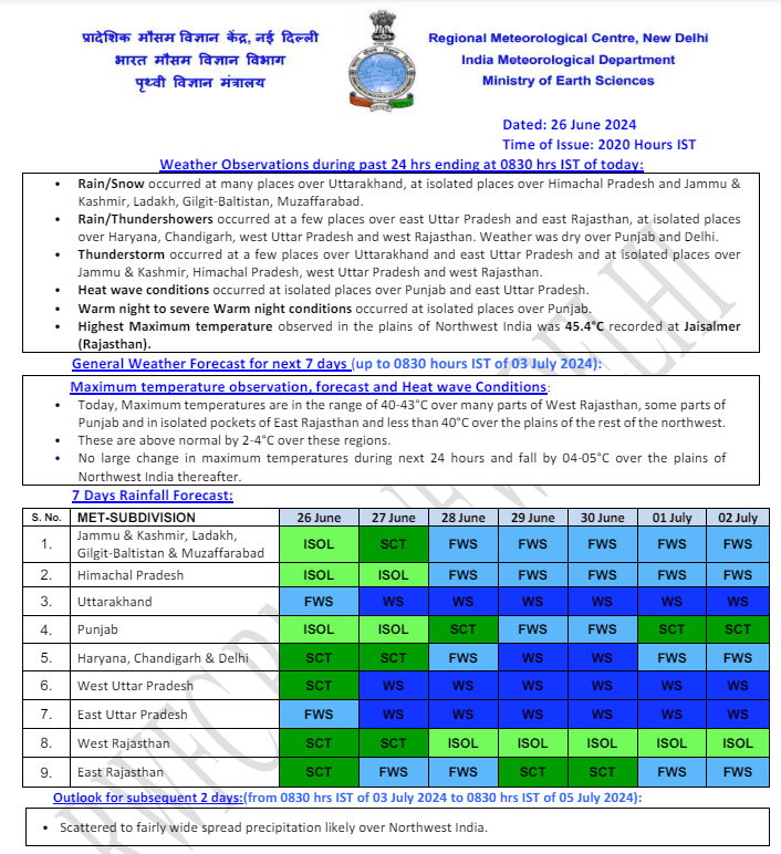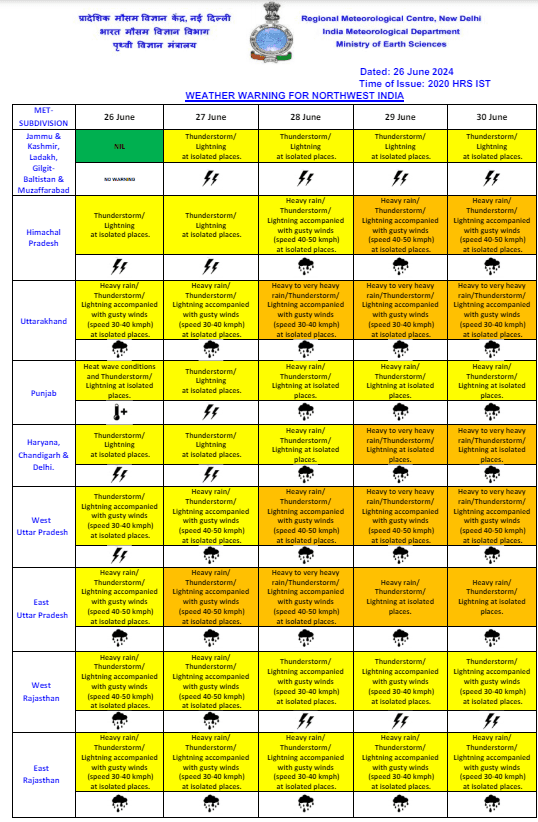 मौसम से जुड़ी जानकारी देने वाले निजी संस्थान ‘स्काईमेट वेदर सर्विसेज’ के अनुसार गुरुवार को केरल, तटीय कर्नाटक, कोंकण और गोवा और गुजरात के कुछ हिस्सों में मध्यम से भारी बारिश की संभावना है. वहीं सिक्किम, असम, मेघालय के अलावा ओडिशा, छत्तीसगढ़ के कुछ हिस्सों में में हल्की से मध्यम बारिश के साथ कुछ स्थानों पर भारी बारिश हो सकती है. उत्तर प्रदेश में भी हल्की से मध्यम बारिश के साथ कुछ स्थानों पर भारी बारिश की संभावना है.