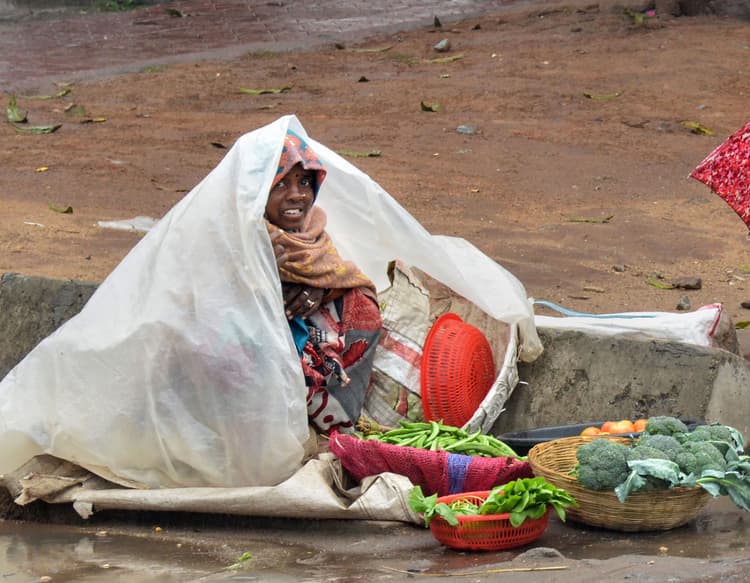Ranchi: A vegetable vendor covers herself with a plastic sheet as it rains, at roadside in Ranchi, Sunday, Jan. 23, 2022. (PTI Photo) (PTI01_23_2022_000017B)