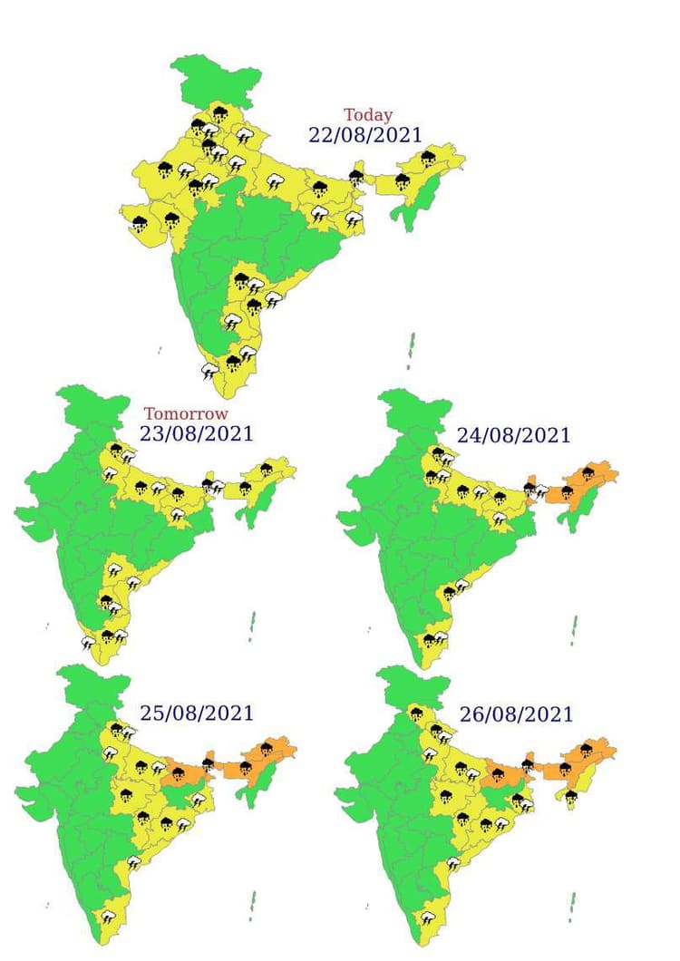मौसम विभाग के अनुसार 22 अगस्त को पंजाब, हरियाणा, राजस्थान और हिमाचल प्रदेश में भारी बारिश की संभावना है, जबकि 24 अगस्त से पूर्वोत्तर भारत, पश्चिम के पहाड़ी क्षेत्र, सिक्किम और बिहार में बारिश की संभावना है. इसके अलावा 24-26 अगस्त के बीच पूर्वोत्तर के राज्यों में बारिश होगी. जबकि 25 अगस्त को असम और मेघालय में भी भारी बारिश की संभावना है.