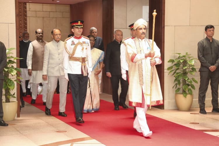 Sengol: संसद के संयुक्त सत्र को जब संबोधित करने के लिए राष्ट्रपति द्रौपदी मुर्मू संसद भवन पहुंचीं तो उपराष्ट्रपति जगदीप धनखड़, प्रधानमंत्री नरेंद्र मोदी और लोकसभा अध्यक्ष ओम बिरला ने स्वागत किया. इस अवसर पर एक अधिकारी हाथ में ‘राजदंड’ (सेंगोल) लिए हुए था.