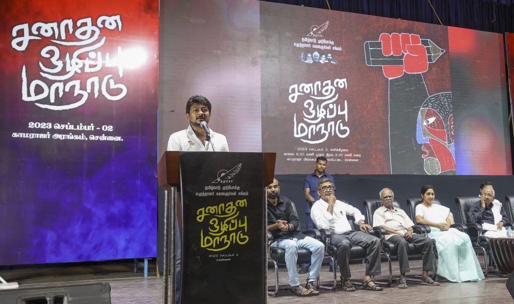 तमिलनाडु में सत्तारूढ़ डीएमके की युवा इकाई के सचिव व राज्य के मंत्री उदयनिधि स्टालिन ने शनिवार को चेन्नई में एक कार्यक्रम में विवादित बयान दिया. उन्होंने सनातन धर्म को समानता व सामाजिक न्याय के खिलाफ बताया और कहा कि इसका उन्मूलन किया जाना चाहिए. सनातन धर्म की तुलना कोरोना वायरस, मलेरिया व डेंगू वायरस व मच्छरों से होने वाले बुखार से की. कहा कि ऐसी चीजों का विरोध नहीं करना चाहिए, बल्कि इन्हें समाप्त कर देना चाहिए. आरोप लगाया कि सनातन ने लोगों को जातियों के आधार पर बांटा है.