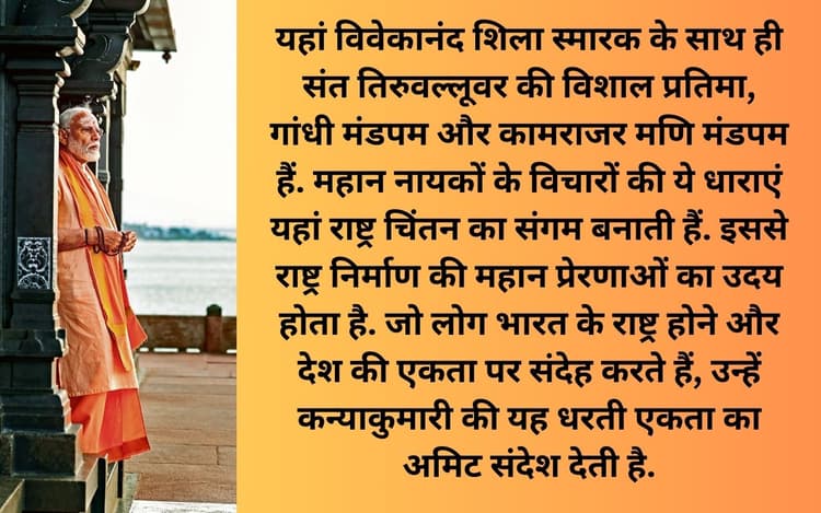 यहां विवेकानंद शिला स्मारक के साथ ही संत तिरुवल्लूवर की विशाल प्रतिमा, गांधी मंडपम और कामराजर मणि मंडपम हैं. महान नायकों के विचारों की ये धाराएं यहां राष्ट्र चिंतन का संगम बनाती हैं. इससे राष्ट्र निर्माण की महान प्रेरणाओं का उदय होता है. जो लोग भारत के राष्ट्र होने और देश की एकता पर संदेह करते हैं, उन्हें कन्याकुमारी की यह धरती एकता का अमिट संदेश देती है.