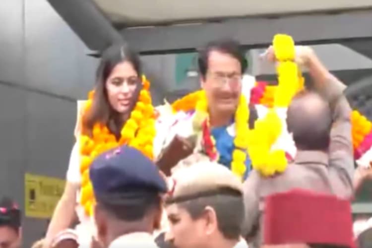 Paris Olympics 2024 में भारत को शुरुआती दो पदक दिलाने वाली भारतीय स्टार शूटर मनु भाकर की वतन वापसी हो गई है. मनु भाकर आज (7 अगस्त) भारत लौटी है. वह दिल्ली के इंदिरा गांधी इंटरनेशनल एयरपोर्ट पर आईं जहां उनका जोरदार स्वागत हुआ. टर्मिनल 3 के वीआईपी गेट से बाहर निकलने के बाद उनका जोरदार स्वागत हुआ, इस दौरान उनके कोच जसपाल राणा भी नजर आए. इस बीच फैंस ने मनु और उनके कोच जसपाल राणा को फूलों की माला से लाद दिया. मनु के स्वागत में फैंस ने मनु भाकर के नाम के जयघोष भी किए. ढोल की थाप पर जमकर लोग जश्न मनाते हुए भी नजर आए. मनु ने इस दौरान पेरिस ओलंपिक में जीते गए दोनों ब्रॉन्ज मेडल भी मीडिया को दिखाएं. रविवार को ओलंपिक खेलों की क्लोजिंग सेरेमनी में भाग लेने के लिए इसी सप्ताह पेरिस लौट जाएंगी. आपकी जानकारी के लिए बता दें, इस बार मनु भाकर समापन समारोह के दौरान भारत की ध्वजवाहक होंगी.