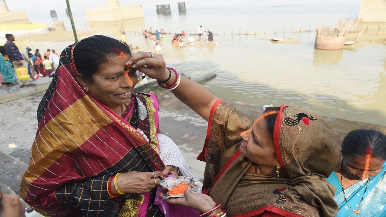 पटना के गंगा घाट पर महिलाओं ने गंगा स्नान के बाद एक दूसरे को सिंदूर लगाया और छठ महापर्व की शुरुआत हुई.