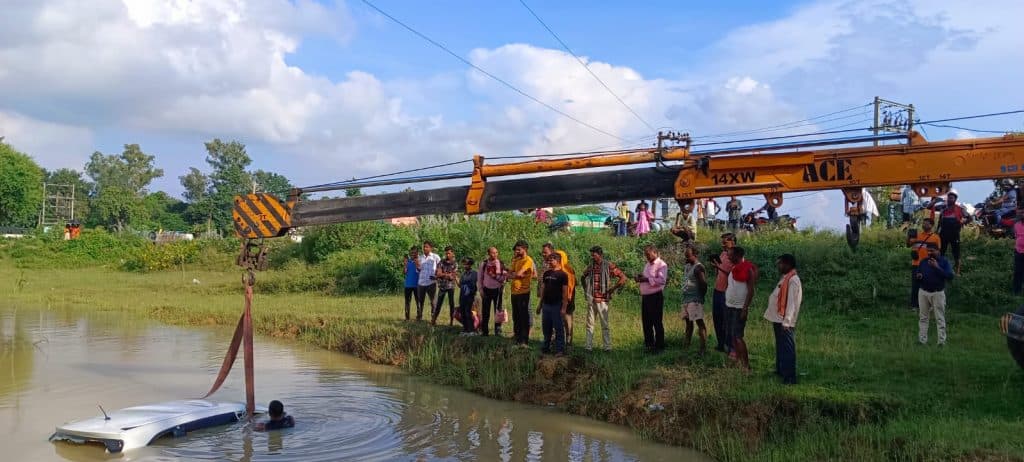 घटना की सूचना पर अवर निरीक्षक एलबी पासवान पुलिस बल के साथ घटना स्थल पर पहुंच कर हाइड्रा मंगाकर पानी मे डूबे कार को तलाब से बाहर निकलवाकर कार व स्कूल बस को अपने कब्जे में ले ली.