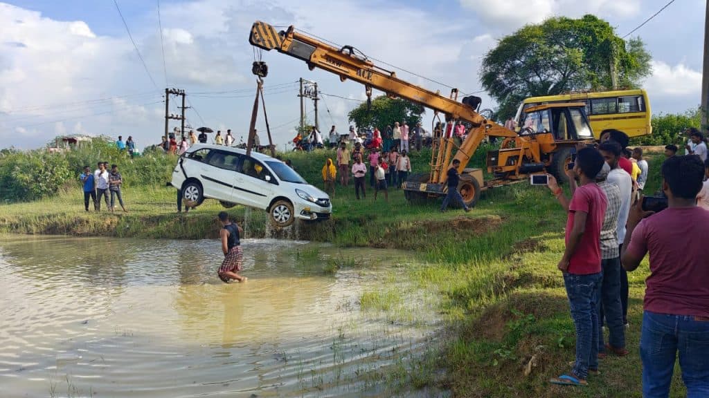 टक्कर इतनी जोरदार थी कि कार सड़क के नीचे पास के तालाब में चली गई. तलाब में पानी रहने के वजह से कार पानी में समाते चली गई. इसी बीच टक्कर की आवाज सुनकर हाई स्कूल के शिक्षक व स्थानीय लोगों की मदद से पानी में डूबे कार से शिक्षिका को सुरक्षित बाहर निकाला गया.