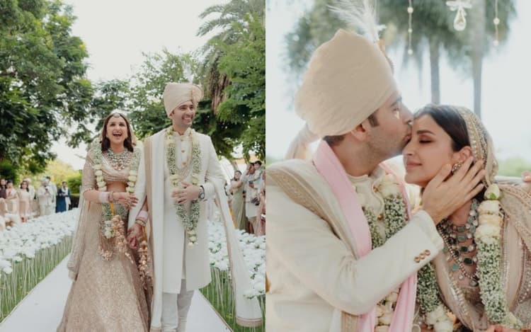 राघव चड्ढा और परिणीति चोपड़ा ने शादी के लिए बहुत ही हल्का कलर चुना था. क्रीम कलर का लहंगा पहने एक्ट्रेस दुल्हन के जोड़े में बला की खूबसूरत लगी. वहीं, व्हाइट शेरवानी में दूल्हेराज काफी जचे.