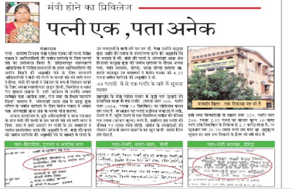 ग्रामीण विकास मंत्री एनोस एक्का की पत्नी मेनोन एक्का ने आदिवासियों की जमीन खरीदने के लिए फर्जी पते का इस्तेमाल किया है. छोटानागपुर काश्तारी अधिनियमन में निहित प्रावधानों के तहत आदिवासियों की जमीन बिक्री की अनुमति देने के लिए सरकारी अधिकारियों ने मंत्री की पत्नी के फर्जी पते को सही करार दे दिया. मंत्री की पत्नी ने ठेकेदार के रूप में निबंधन कराने के लिए अपना स्थायी पता ठाकुर टोली सिमडेगा व थाना रोड गुमला बताया है. इसी आवेदन में उन्होंने अपना वर्तमान पता अशोक नगर , रोड नंबर दो स्थित बलवीर विला बताया है. ओरमांझी थाना क्षेत्र में ननकु मुंडा वगैरह से जमीन खरीदने के लिए मेनोन एक्का ने अपना पता ओरमांझी थाना क्षेत्र का करमा गांव बताया.