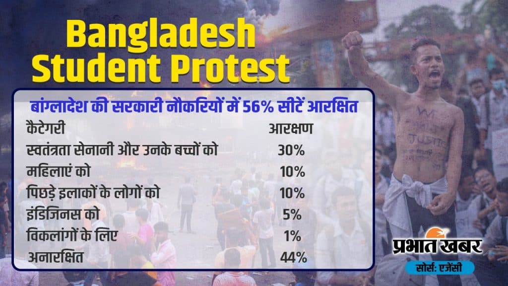 16 दिसंबर 1971 को बांग्लादेश, पाकिस्तान से अलग होकर स्वतंत्र राष्ट्र बना. विदेशी मामलों के जानकार प्रो सतीश कुमार बताते हैं कि स्वतंत्र राष्ट्र के लिए जिन लोगों ने लड़ाई लड़ी उन्हें और उनके बच्चों को 1972 में सरकारी नौकरियों में 30% आरक्षण देने की घोषणा की गई. बाद में वहां महिलाओं के लिए 10%, पिछड़े इलाकों के लोगों के लिए 10%, इंडिजिनस को 5% और विकलांगों के लिए 1% सीट आरक्षित कर दी गई. इससे सरकारी नौकरियों की कुल 56% सीट आरक्षित हो गईं.