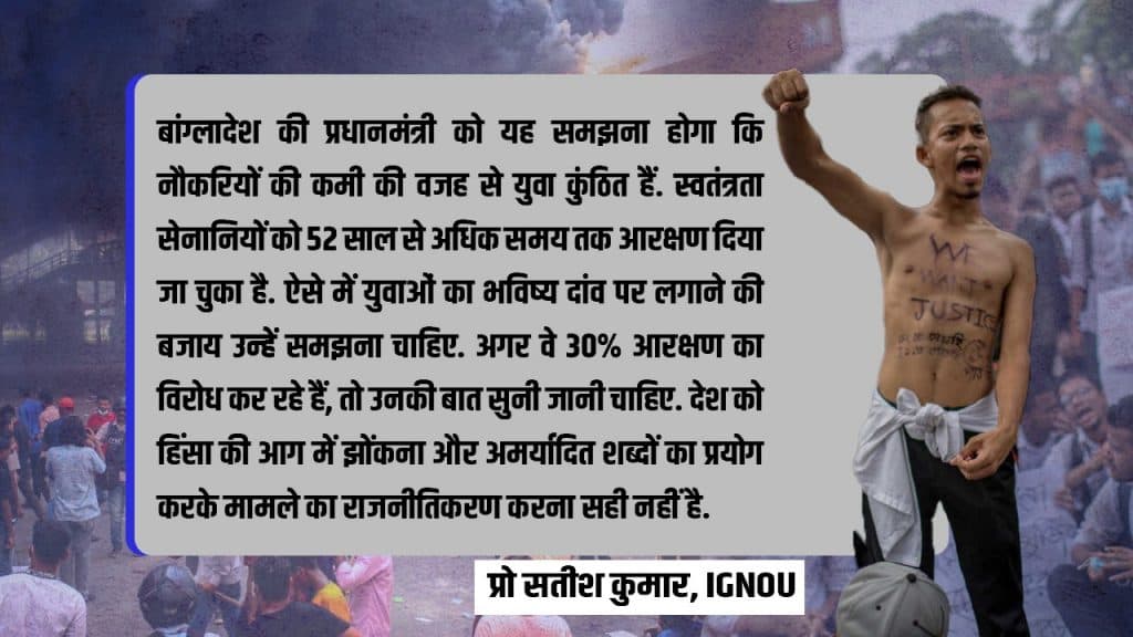 बांग्लादेश में जो 56% आरक्षण है उसमें से सिर्फ 30% पर ही युवाओं को एतराज है, 26% आरक्षण को वे स्वीकार कर रहे हैं. युवाओं का कहना है कि स्वतंत्रता सेनानी या तो अब रहे नहीं या बहुत बूढ़े हो चुके हैं. उनकी दूसरी पीढ़ी के बाद अब तीसरी पीढ़ी भी आरक्षण का लाभ उठा रही है. आखिर यह कबतक जारी रहेगा?