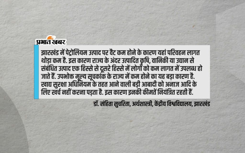 सितंबर महीने के उपभोक्ता मूल्य सूचकांक पर अगर गौर करें तो बिहार-यूपी के अलावा आंध्र प्रदेश, असम, गुजरात, कर्नाटक, केरल, मध्य प्रदेश और राजस्थान जैसे बड़े प्रदेशों में दैनिक जरूरत के सामान अधिक महंगे हैं. इसके अलावा तमिलनाडु, तेलंगाना, उत्तर प्रदेश, पश्चिम बंगाल जैसे राज्यों से झारखंड में रोजमर्रा की वस्तुएं सस्ती है.