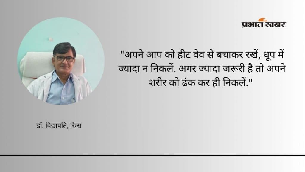 रिम्स के डॉ. विद्यापति ने प्रभात खबर से बात करते हुए बताया कि गर्मी में निकलने से पहले घर में नींबू,पानी नमक और चीनी मिश्रित शर्बत पीनी चाहिए, छाछ या मट्ठा भी ले सकते हैं. प्याज खाने का कोई वैज्ञानिक कारण नहीं है. फ्ल्यूड और एलेक्ट्रोलाइट का सेवन बढ़ा देना चाहिए. बॉडी का एक टेंपरेचर होता है, अगर उससे ऊपर गया तो दिक्कत होगी या इससे नीचे गयी तब भी दिक्कत होगी. ऐसे में शरीर के तापमान को मेंटेन रखना चाहिए. धूप में कम से कम निकलना चाहिए. बॉडी में पानी और नमक की कमी को कभी कम नहीं होने देना चाहिए.
