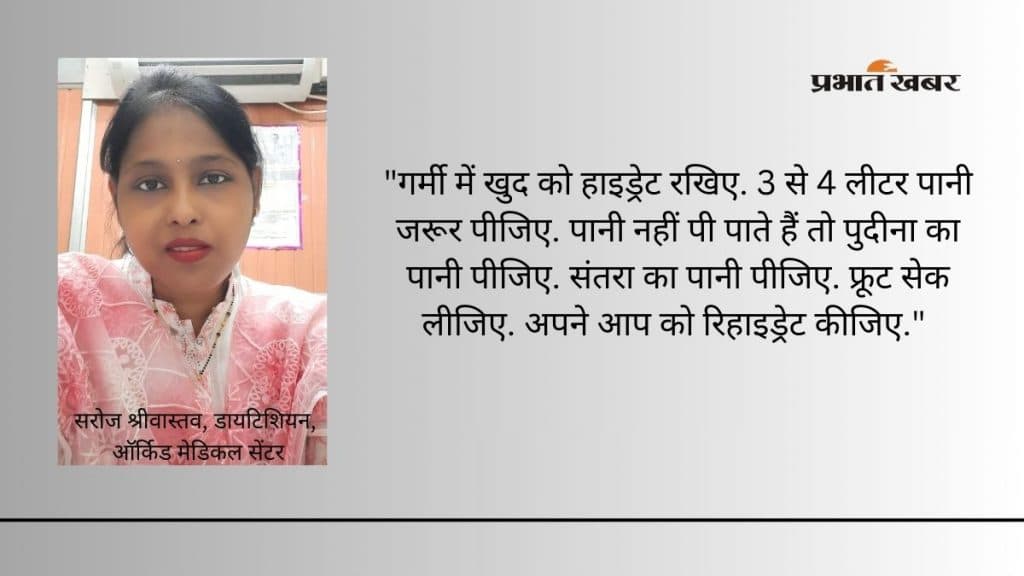 प्रभात खबर से बात करते हुए वैध डॉ. वेंकटेश कात्यायन पांडेय बताते हैं कि गर्मी में प्याज का इस्तेमाल ज्यादा करें. तैलीय चीजों का इस्तेमाल कम कर दें. पानी पर्याप्त मात्रा में ले. लस्सी का सेवन करें. पुदीना का पानी पिएं. गर्मी बढ़ने से पाचन कम हो जाता है. तैलीय चीजों का इस्तेमाल कम करें. तरल भोजन ज्यादा लें. ज्यादा परिश्रम न करें. बीच-बीच में ओआरएस का घोल लेते रहे. बढ़ती गर्मी से बीपी लो होने लगता है. ऐसे में सीजनल फ्रूट्स लेते रहना चाहिए. किचेन में काम करने वाली महिलाओं को समय – समय पर पानी लेते रहना चाहिए. गर्मी से लोग बेहोश भी हो जाते हैं.