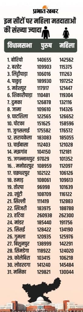 झारखंड विधानसभा में कुल 81 सीट हैं और बहुमत का आंकड़ा 41 सीटों का है. 31 सीटों पर महिला वोटर्स पुरुषों से ज्यादा है, यानी अगर कोई पार्टी महिलाओं को रिझा लेती है, तो उसे सरकार तक पहुंचने के लिए और सिर्फ 10 सीटों पर जीत हासिल करनी होगी. नवीनतम आंकड़ों के अनुसार जिन सीटों पर महिलाएं पुरुषों से आगे हैं वे इस प्रकार हैं-
