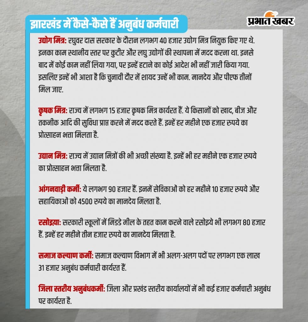 झारखंड सरकार में सालों से अनुबंध पर काम कर रहे पांच लाख कर्मचारियों को भी आशा है कि चुनाव की घोषणा से पहले हेमंत सरकार उन्हें भी पीएफ(प्रॉविडेंट फंड यानी भविष्य निधि) से जोड़ने की घोषणा कर सकती है.