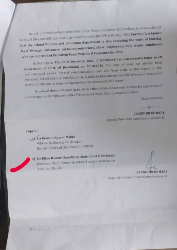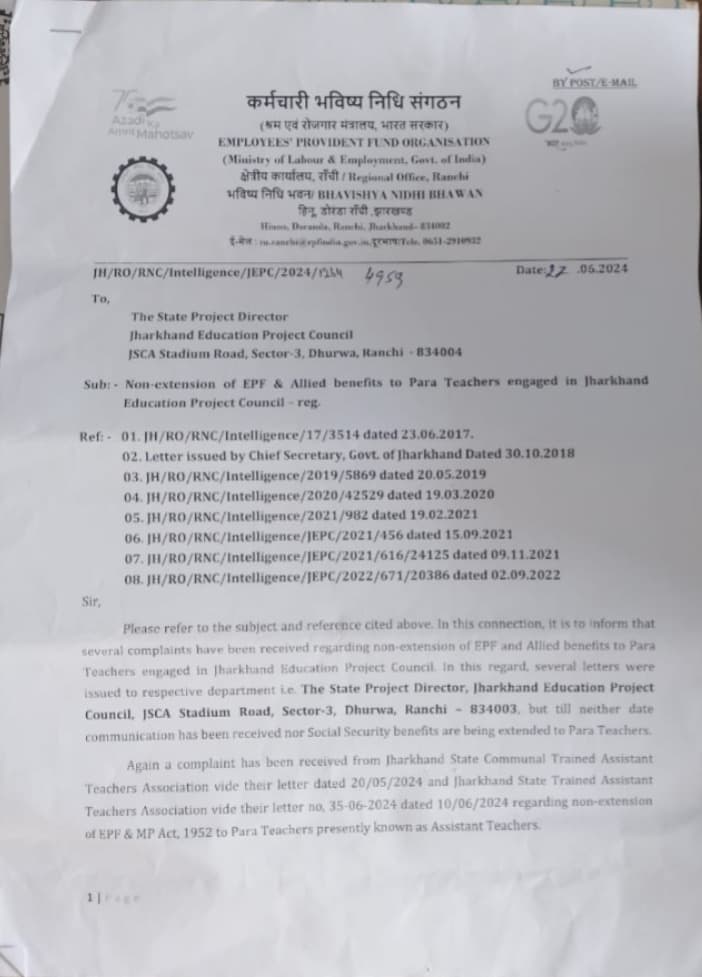 हाल ही में भविष्य निधि आयुक्त रणधीर कुमार ने झारखंड राज्य शिक्षा परियोजना के परियोजना निदेशक को पत्र भेजकर पारा शिक्षकों को सामाजिक सुरक्षा सुविधाओं के नहीं मिलने पर चिंता जाहिर की थी. उन्होंने मुख्य सचिव की राज्य सरकार के विभिन्न विभागों को भेजे गए एक पत्र का हवाला भी दिया था.
