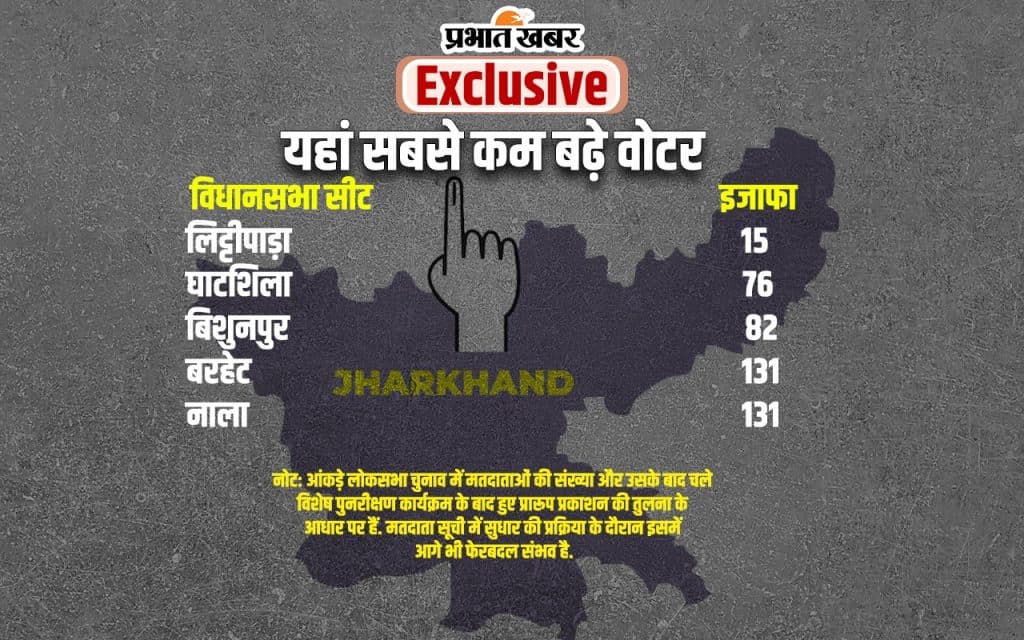 लोकसभा चुनाव के बाद सबसे कम 15 मतदाता लिट्टीपाड़ा विधानसभा सीट पर बढ़े हैं. लिट्टीपाड़ा सीट आदिवासियों के लिए रिजर्व है. यानी यहां से केवल आदिवासी उम्मीदवार ही विधानसभा चुनाव लड़ सकते हैं. इसके बाद मतदाताओं की संख्या में दूसरा सबसे कम इजाफा घाटशिला विधानसभा सीट पर हुआ है. यहां केवल 76 मतदाता बढ़े हैं. यह भी आदिवासियों के लिए रिजर्व विधानसभा सीट है. इसी तरह मतदाताओं का आंकड़ा तीसरा सबसे कम बढ़ने का गवाह बनी विधानसभा सीट बिशुनपुर भी ट्राइबल रिजर्व सीट है. यहां पिछले चार महीनों में केवल 82 मतदाता बढ़े हैं. मुख्यमंत्री हेमंत सोरेन की विधानसभा सीट बरहेट भी मतदाताओं की संख्या बढ़ने के मामले में बॉटम-5 सीटों में चौथे पायदान पर है. यह भी आदिवासी सीट है. यहां लोकसभा चुनाव के बाद केवल 131 मतदाता बढ़े हैं. विधानसभाध्यक्ष रवींद्रनाथ महतो की विधानसभा सीट नाला मतदाताओं की संख्या के ग्राफ बढ़ने वाली विधानसभा सीटों में सबसे नीचे के पायदान वालों में से एक है. यहां भी बरहेट के बराबर केवल 131 मतदाता ही बढ़े हैं. बॉटम-5 में केवल यही आदिवासी रिजर्व सीट नहीं है.