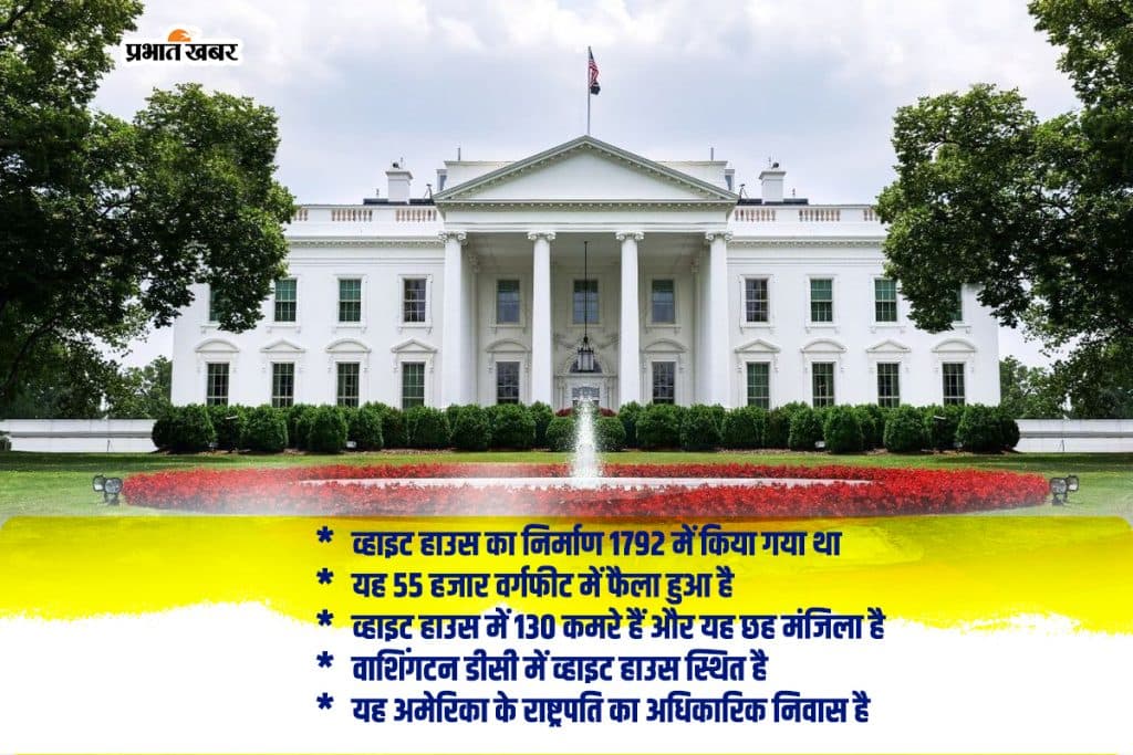 व्हाइट हाउस अमेरिकी राष्ट्रपति का अधिकारिक निवास स्थान है. इस हाउस का निर्माण आयरिश मूल के आर्किटेक्ट जेम्स होबन ने किया है. सफेद रंग की पत्थरों से इस भवन की बाहरी दीवारों का निर्माण किया गया है. वर्तमान में जो व्हाइट हाउस है वह छह मंजिला है और इसमें दो मंजिला बेसमेंट बनाया गया है. व्हाइट हाउस में 130 के करीब कमरे हैं और यह 55 हजार वर्गफीट में बना हुआ है. यहां अतिथियों के रहने की भी विशेष व्यवस्था है.