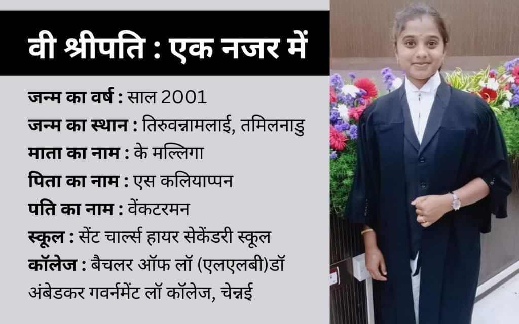 तीन भाई-बहनों में सबसे बड़ी श्रीपति का शुरुआती जीवन काफी मुश्किल और संघर्षों से भरा रहा है. उनके पिता एस कलियाप्पन जैसे-तैसे खेती-किसानी कर अपने बच्चों का पालन-पोषण किया करते थे. जबकि, उनकी मां के मल्लिगा गांव में ही दूसरों के घरों में बर्तन मांजने और खाना बनाने का काम किया करती थीं. तमाम परेशानियों के बावजूद उनके माता-पिता ने उन्हें पढ़ाने में कोई कसर नहीं छोड़ी. अपने छोटे भाई-बहन के सरन्या और के सूर्यप्रकाश के साथ वी श्रीपति ने अथनावूर गांव स्थित सेंट चार्ल्स हायर सेकेंडरी स्कूल से विज्ञान विषय में 12वीं तक की पढ़ाई पूरी की. इसके बाद उन्होंने आगे की पढ़ाई के लिए डॉ अंबेडकर गवर्नमेंट लॉ कॉलेज, चेन्नई में दाखिला ले लिया.