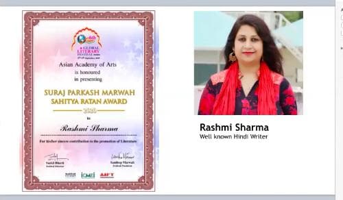 एशियन एकेडमी ऑफ आर्ट्स तथा मारवाह स्टूडियो नोएडा द्वारा आयोजित तीन दिवसीय छठे ग्लोबल लिटरेरी फेस्टिवल के प्रथम दिन आज सूरज प्रकाश मारवाह साहित्य रत्न अवॉर्ड सम्मान समारोह का आयोजन किया गया जिसमें राँची निवासी सुपरिचित कथाकार और कवयित्री रश्मि शर्मा को उनकी साहित्य साधना के लिये सम्मानित किया गया.