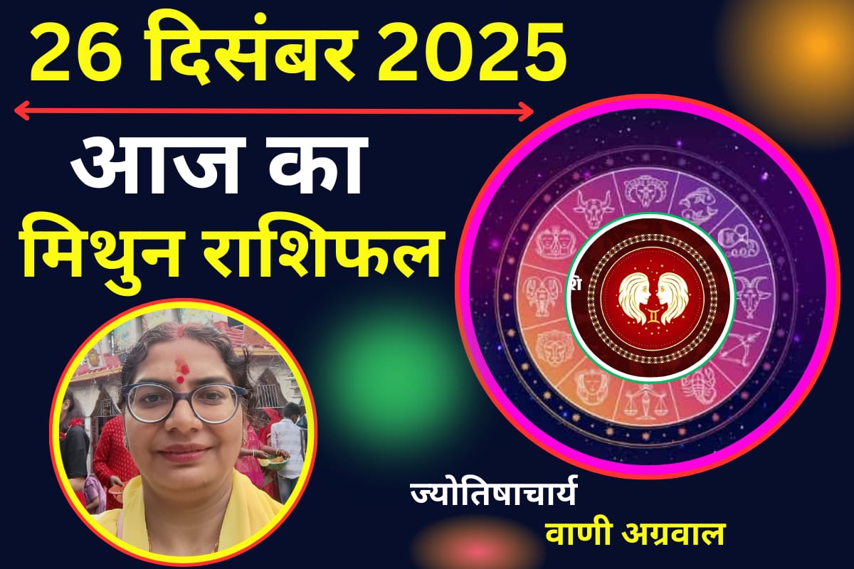 Aaj ka mithun rashifal 26 December 2025: आज 26 दिसंबर 2025 दिन शुक्रवार है पंचांग के अनुसार आज पौष माह की शुक्ल पक्ष की षष्ठी तिथि 1:43 दिन तक रहेगी ,इसके बाद सप्तमी तिथि आरंभ होगी. ग्रहों के राजा सूर्य, मंगल एवं शुक्र के साथ धनु राशि में उपस्थित है .वही चंद्रमा राहु के साथ कुंभ राशि में रहेंगे. शनि मीन राशि में है तथा गुरुदेव बृहस्पति मिथुन राशि में वक्री होकर विराजमान है. केतु सिंह राशि में और बुद्ध वृश्चिक राशि में बैठे हैं. आईए जानते हैं ज्योतिषाचार्य वाणी अग्रवाल से आज का दिन कैसा रहेगा.