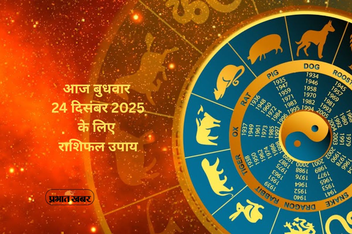 Aaj Ka Rashifal Upay 24 December 2025: आज बुधवार का दिन भगवान गणेश और बुध ग्रह को समर्पित माना जाता है. यह दिन बुद्धि, वाणी, व्यापार और निर्णय क्षमता से जुड़ा होता है. 24 दिसंबर को यदि राशि अनुसार उपाय किए जाएं, तो ग्रह दोष शांत होते हैं और जीवन में सकारात्मक बदलाव आते हैं. आइए जानते हैं ज्योतिषाचार्य डॉ एन के बेरा से मेष से मीन तक सभी राशियों के लिए सरल और प्रभावी उपाय.