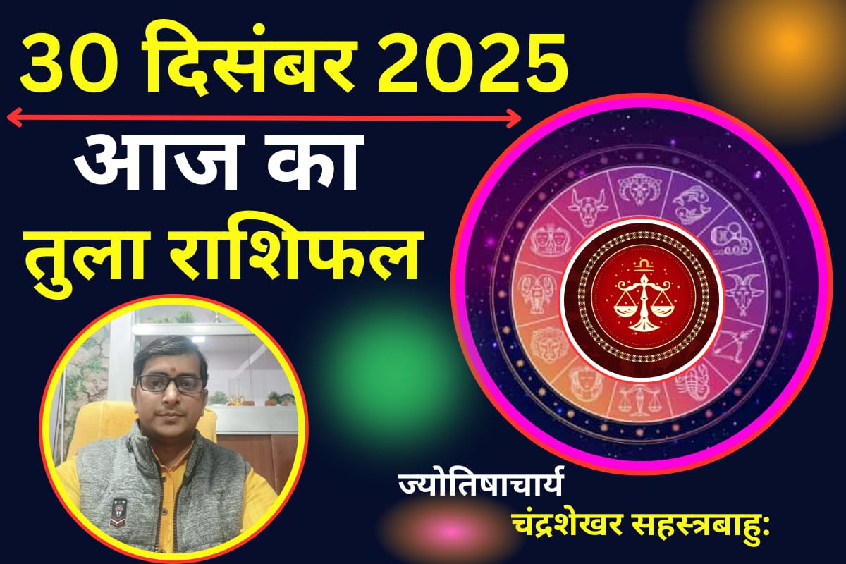 Tula Aaj Ka Rashifal 30 December 2025: आज 30 दिसंबर 2025, दिन मंगलवार है. पंचांग के अनुसार आज पौष माह के शुक्ल पक्ष की एकादशी रहेगी उपरांत द्वादशी तिथि हो जाएगी. ग्रहों की स्थिति की बात करें तो सूर्य के साथ मंगल,बुध और शुक्र धनु राशि में, चंद्रमा मेष राशि मे और राहु कुंभ राशि में विराजमान है. देव गुरु बृहस्पति मिथुन राशि में ,केतु सिंह राशि में स्थित हैं और शनि मीन राशि में स्थित हैं. क्या आप जानना चाहेंगे कि आपका आज का दिन आपकी राशि के अनुसार कैसा रहने वाला हैं. क्या आज रुके हुए कार्य पूरे होंगे? क्या होगा आज का शुभ अंक, कैसा होगा आज का लक्की रंग, इसके बारे में ज्योतिषाचार्य एवं हस्तरेखा विशेषज्ञ चंद्रशेखर सहस्त्रबाहु: ने सटीक आंकलन किया हैं. तो आइए जानते हैं तुला राशि के लिए कैसा रहेगा आज का दिन मंगलवार ….