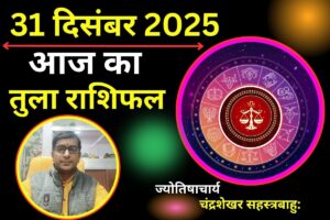 Tula Aaj Ka Rashifal 31 December 2025: आज 31 दिसंबर 2025, दिन बुधवार है. पंचांग के अनुसार आज पौष माह के शुक्ल पक्ष की द्वादशी तिथि रहेगी . ग्रहों की स्थिति की बात करें तो सूर्य के साथ मंगल,बुध और शुक्र धनु राशि में, चंद्रमा मेष राशि में सुबह 09:23 AM तक रहेंगे, उसके बाद वृषभ राशि में प्रवेश करेंगे और राहु कुंभ राशि में विराजमान है. देव गुरु बृहस्पति मिथुन राशि में ,केतु सिंह राशि में स्थित हैं और शनि मीन राशि में स्थित हैं. क्या आप जानना चाहेंगे कि आपका आज का दिन आपकी राशि के अनुसार कैसा रहने वाला हैं. क्या आज रुके हुए कार्य पूरे होंगे? क्या होगा आज का शुभ अंक, कैसा होगा आज का लक्की रंग, इसके बारे में ज्योतिषाचार्य एवं हस्तरेखा विशेषज्ञ चंद्रशेखर सहस्त्रबाहु: ने सटीक आंकलन किया हैं. तो आइए जानते हैं तुला राशि के लिए कैसा रहेगा आज का दिन बुधवार ….