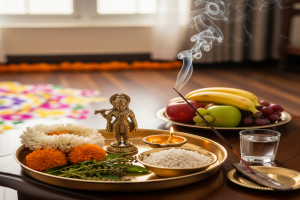 - भगवान को फल, फूल, अक्षत, वस्त्र, मिठाई, दीपक और धूप अर्पित करें.