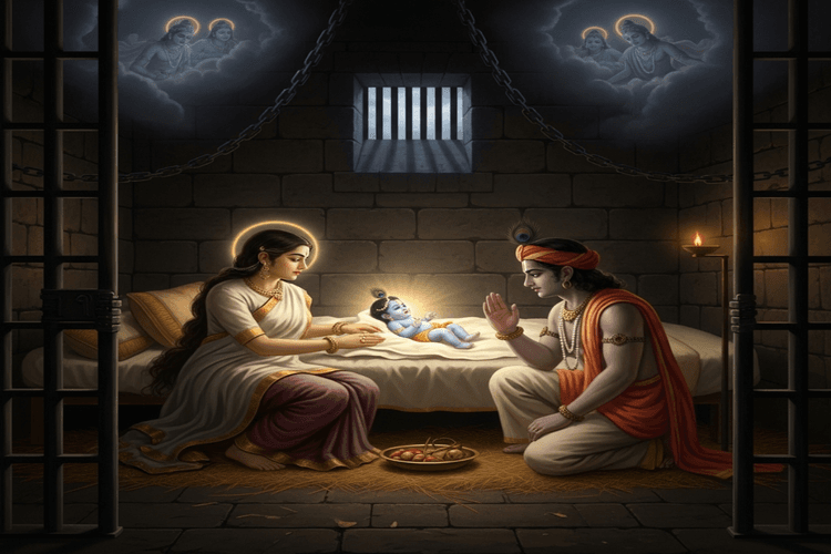 - जब देवकी ने आठवें पुत्र को जन्म दिया, तभी कारागार में दिव्य प्रकाश फैला. उनके सामने चतुर्भुज रूप में शंख, चक्र, गदा और पद्म धारण किए भगवान विष्णु प्रकट हुए. वसुदेव और देवकी ने उनके चरणों में प्रणाम किया. भगवान ने कहा—