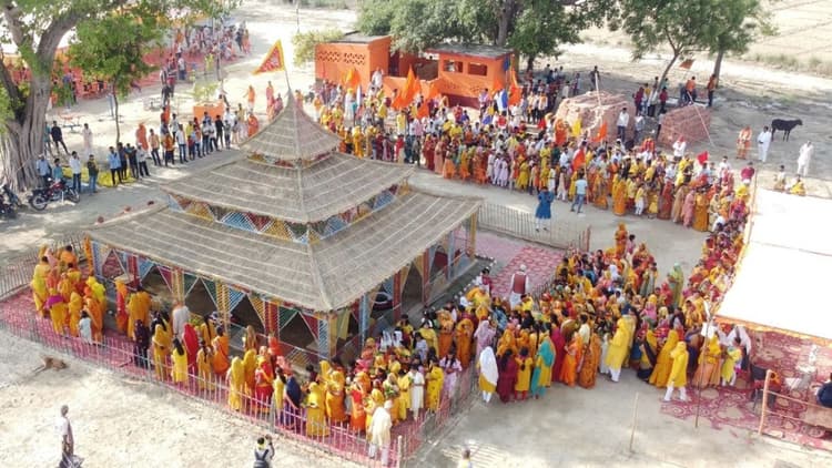 कलश यात्रा के दौरान पीले परिधान में हाजरों की संख्या में महिलाएं और पुरुष श्रद्धालुओं में काफी उत्साह और श्रद्धा व भक्ति का माहौल देखने को मिला. गाजे-बाजे के साथ निकली जलभरी शोभा यात्रा को देखने के लिए पूरा गांव उमड़ पड़ा.