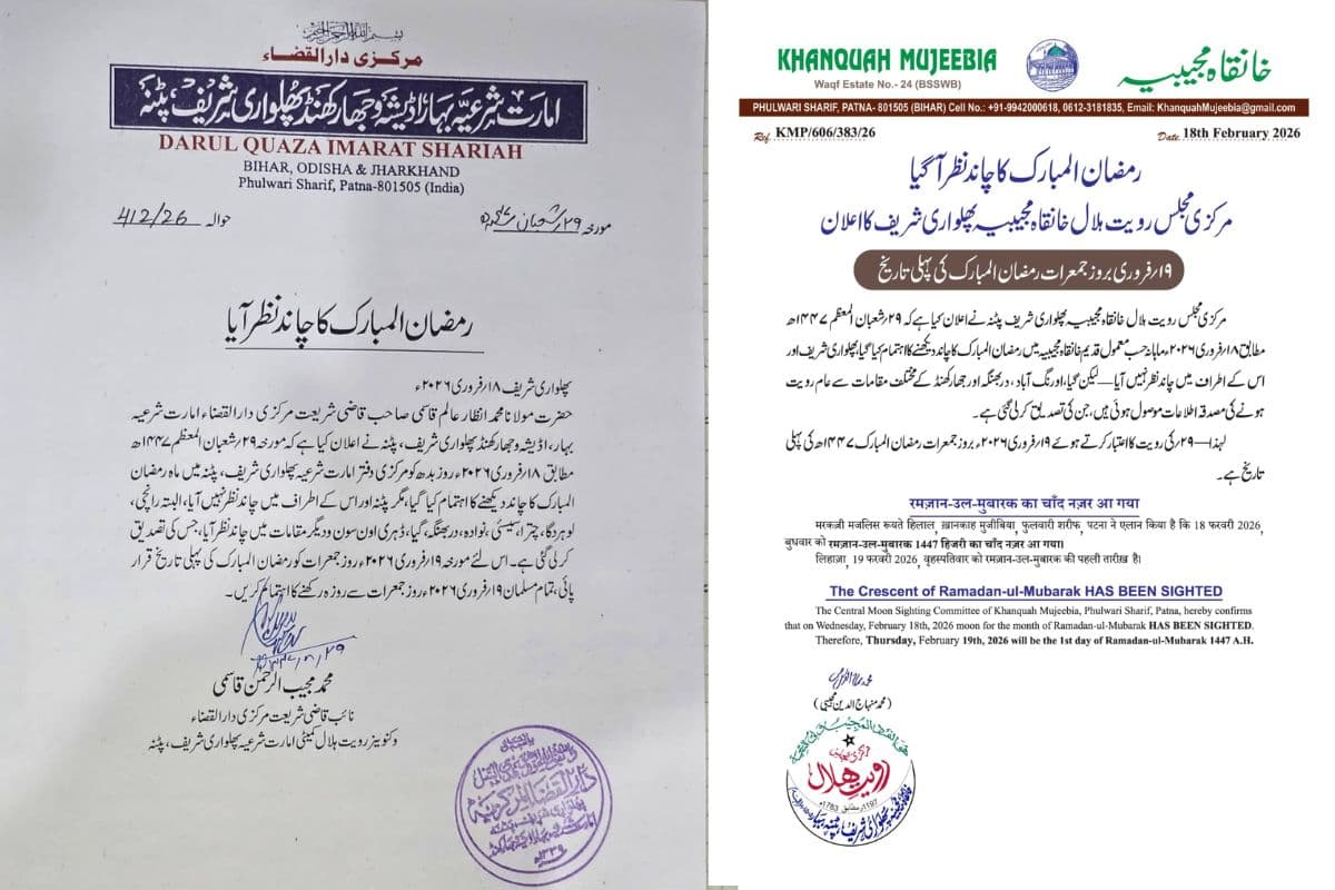Ramzan 2026: इस्लामिक कैलेंडर के सबसे पवित्र महीने रमजान उल मुबारक का चांद बुधवार की शाम देश के विभिन्न हिस्सों में नजर आ गया. चांद दिखने की तस्दीक होते ही गुरुवार से रमजान के मुकद्दस महीने की शुरुआत हो गई और गुरुवार की सुबह से पहला रोजा रखा जाएगा. रमजान माह का मुकद्दस चांद बिहार के गया, नवादा, समस्तीपुर के मुसरी घरारी, दरभंगा तथा झारखंड के रांची, लोहरदगा, चतरा सहित असम और देश के विभिन्न हिस्सों में देखे जाने की सूचना मिलने के बाद बिहार, झारखंड और उड़ीसा के मुसलमानों की सबसे बड़ी एदारा इमारत ए शरिया तथा प्रसिद्ध खानकाह मुजीबिया सहित तमाम मुस्लिम एदारों ने ऐलान किया कि रमजान मुबारक का पहला रोजा गुरुवार से शुरू होगा.