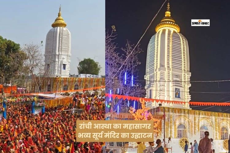 Surya Mandir: रांची के इटकी बाहरी तलाव स्थित नव निर्मित सूर्य मंदिर में प्राण प्रतिष्ठा महोत्सव और पांच दिवसीय पूजा-अनुष्ठान की शुरुआत भव्य कलश शोभायात्रा के साथ हो गई. इस धार्मिक आयोजन में आसपास के गांवों और क्षेत्रों से हजारों श्रद्धालु शामिल हुए. बीते शुक्रवार सुबह करीब 10 बजे 5100 महिलाओं ने कलश लेकर विशाल शोभायात्रा निकाली, जिसने पूरे इलाके को भक्तिमय माहौल में बदल दिया.