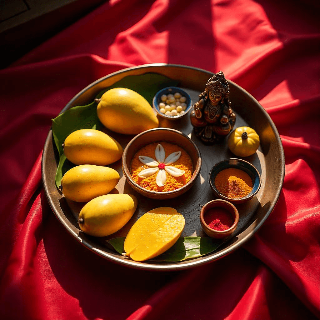 फल और मिठाई भगवान को भोग लगाने के लिए आवश्यक होते हैं. इस दिन व्रती स्त्रियाँ मौसमी फल और विशेष रूप से सात प्रकार के अनाज (सात धान्य) का भोग अर्पित करती हैं इससे व्रत का पुण्य कई गुना बढ़ जाता है और देवी सावित्री का आशीर्वाद प्राप्त होता है.