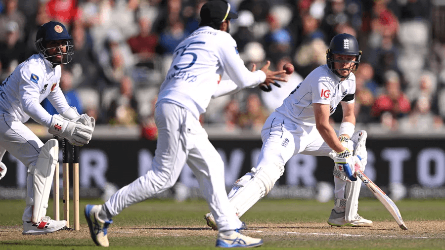 पोप, जगह की कमी के कारण, असिथा फर्नांडो की गेंद पर पुल शॉट को मिस कर गए, जिसे श्रीलंका के कप्तान धनंजय डी सिल्वा ने स्क्वायर लेग पर कैच कर लिया, जिससे इंग्लैंड का स्कोर 42-2 हो गया. बाद में डकेट ने स्पिनर प्रभात जयसूर्या के पहले ओवर में रिवर्स स्वीप पर टॉप एज मारा, जिसे कुमारा ने बाउंड्री के पास कैच कर लिया, जिससे स्कोर 82-3 हो गया.