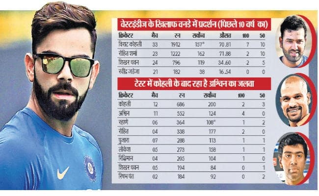 वेस्टइंडीज के खिलाफ पिछले 10 वर्षों की प्रदर्शन की बात करें,तो विराट कोहली ने ही सबसे अधिक रन बनाये हैं. कोहली ने जहां वनडे में 33 मैचों में 1912 रन बनाये , वहीं सबसे अधिक सात शतक जड़े हैं. रोिहत शर्मा भी वेस्टइंडीज के खिलाफ रन बना चुके हैं, लेकिन शतक लगाने में अभी पीछे दिखायी दे रहे हैं. विश्व कप के बाद चोट से उबरे धवन का भी बल्ला इस बार गरजेगा. देखना यह है कि धवन की वापसी के बाद लोकेश का स्थान सुरक्षित रहेगा या उन्हें चौथे नंबर पर बल्लेबाजी के लिए आजमाया जायेगा. लोकेश ने धवन की अनुपस्थिति में विश्व कप के दौरान अच्छा प्रदर्शन किया था.
