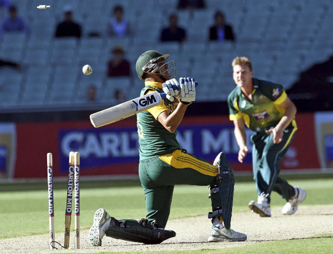 अपने 19वें वनडे शतक की ओर बढ़ते दिख रहे डिविलियर्स को तेज गेंदबाज पैट कमिंस ने स्टीव स्मिथ के हाथों लपकवाया. उसके बाद से कमिंस, मिशेल स्टार्क और फाकनर ने दक्षिण अफ्रीकी बल्लेबाजों को खुलकर खेलने नहीं दिया. डेविड मिलर ने 61 गेंद में तीन चौकों की मदद से 45 रन बनाये जबकि फाफ डु प्लेसिस ने 37 गेंद में 28 रन बनाये. ऑस्ट्रेलिया के लिये कमिंस और फाकनर ने दो दो विकेट लिये.