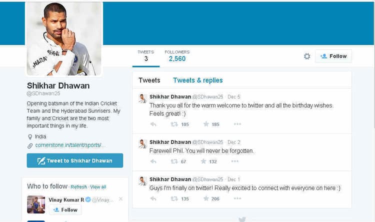 यहां सभी लोगों से जुड़कर मैं रोमांचित हूं. इस संदेश को 133 बार री ट्वीट किया गया जबकि 205 बार फेवरेट बनाया गया. शुरुआती कुछ दिनों में ही धवन के 2400 फालोअर्स बन गये हैं.