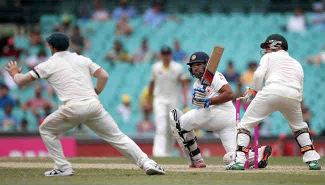 इससे पहले ऑस्ट्रेलिया ने अपनी पारी शुक्रवार के छह विकेट पर 251 रन के स्कोर पर ही घोषित की. इससे भारत को सीरीज में अपनी पहली जीत दर्ज करने के लिए 90 ओवर में 349 रन का मुश्किल लक्ष्य मिला. भारत ने जल्द ही युवा सलामी बल्लेबाज लोकेश राहुल (16) का विकेट गंवा दिया. फिर विजय और रोहित शर्मा (39) ने दूसरे विकेट के लिए 56 रन जोड़ कर पारी को संभाला. विजय ने पारी के दसवें ओवर में लायन की गेंद पर 16 रन जुटाये. लंच तक भारत ने एक विकेट पर 73 रन बनाये थे. लंच के बाद भारत ने रोहित का विकेट गंवाया. चायकाल तक भारत ने दो विकेटों पर 160 रन बनाये. विजय और विराट के आउट होने से भारत काफी दबाव में आ गया था.