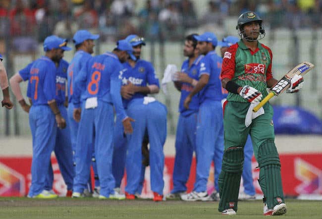 भारत को पहली सफलता हालांकि कुलकर्णी ने दिलायी. तमीम इकबाल (13) ने उनकी गेंद पर स्लिप में कैच थमाया. इससे पहले कुलकर्णी के शुरुआती ओवर में विराट कोहली ने उनका कैच लेने का दावा किया था लेकिन अंपायर ने बल्लेबाज के पक्ष में फैसला सुनाया. सौम्या सरकार और लिट्टन दास ने इसके बाद दूसरे विकेट के लिये 52 रन जोडे. अक्षर पटेल जब अपना पहला ओवर करने के लिये आये तो सरकार ने छक्के और लिट्टन ने दो चौकों से उनका स्वागत किया. भारत ने 12 रन के अंदर इन दोनों बल्लेबाजों को आउट करके अपनी उम्मीद बनाये रखी. अश्विन ने सरकार को पगबाधा आउट किया जबकि पटेल ने लिट्टन को ढीला शाट खेलने के लिये मजबूर किया और धोनी ने कैच लेने में कोई गलती नहीं की. भारत को जल्द ही रहीम का विकेट भी मिल जाता लेकिन पटेल की गेंद पर रैना ने स्लिप में उनका कैच छोड दिया. रहीम तब नौ रन पर थे.