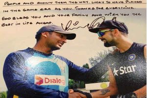 आप जीत के साथ नहीं जा सके लेकिन आपकी उपलब्धियां हमेशा याद रहेंगी. इससे पहले सिरिसेना ने सिंहली भाषा में दिये अपने भाषण में संगकारा को ब्रिटेन में श्रीलंका के उच्चायुक्त के पद की पेशकश कर दी. हर टेस्ट टीम के खिलाफ शतक जमाने वाले 12 क्रिकेटरों में शामिल संगकारा को कोहली ने भी सम्मानित किया. भारतीय कप्तान ने उन्हें टीम के हर सदस्य के आटोग्राफ वाली टीम जर्सी भेंट की. संगकारा जब बोलने के लिए आये तो अपने आंसुओं पर काबू रखना उनके लिए मुश्किल हो गया था.