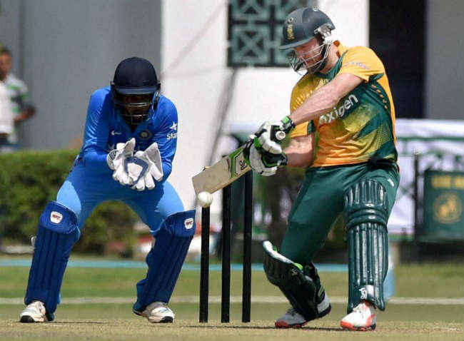 डिविलियर्स अगले ओवर में यादव का शिकार हुए जिनका कैच शार्ट फाइन लेग पर नेगी ने लपका. दक्षिण अफ्रीका का स्कोर 10 ओवर के बाद दो विकेट पर 90 रन था. डिविलियर्स ने अपनी पारी में तीन चौके और दो छक्के लगाये. भारत ए के गेंदबाजों ने आखिरी दस ओवर में 99 रन दे डाले. भारत ए स्तर पर पहला प्रतिस्पर्धी मैच खेल रहे हार्दिक पंड्या ने डेविड मिलर (10) को आउट किया.