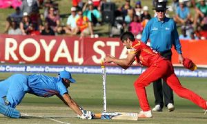 रायुडू को चामू चिभाभा ने बोल्ड किया जबकि मनदीप भी इसी गेंदबाज का शिकार हुए जिनका कैच मुतोम्बोजी ने डाइव लगाकर लपका. भारत का स्कोर तीन विकेट पर 60 रन था जब केदार जाधव और पांडे साथ आये. दोनों ने 30 रन जोडे लेकिन मुजाराबानी ने जाधव को आउट कर दिया. इस समय धोनी मैदान पर उतरे लेकिन अपना चिर परिचित फार्म नहीं दिखा सके.