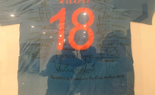 इस जर्सी पर कोहली के अलावा युवराज सिंह, आशीष नेहरा, जसप्रीत बुमराह, सुरेश रैना, पवन नेगी, मोहम्मद शमी, रवींद्र जडेजा, भुवनेश्वर कुमार, अजिंक्य रहाणे, शिखर धवन, रविचंद्रन अश्विन, हार्दिक पांड्या और भारतीय टीम के पूर्व निदेशक रवि शास्त्री के हस्ताक्षर हैं.