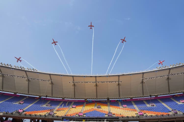 भारतीय वायु सेना (आईएएफ) की एरोबेटिक (हवा में कलाबाजी) टीम सूर्यकिरण ने 19 नवंबर को यहां नरेंद्र मोदी स्टेडियम में भारत और ऑस्ट्रेलिया के बीच क्रिकेट विश्व कप फाइनल से पहले शुक्रवार को एयर शो (हवा में विमानों का करतब) का अभ्यास किया.