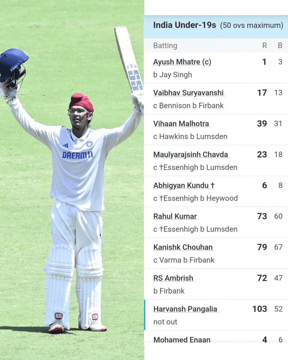 आयुष म्हात्रे (Ayush Mhatre) की कप्तानी में भारतीय टीम ने बल्लेबाजी और गेंदबाजी दोनों विभागों में जबरदस्त प्रदर्शन करते हुए मुकाबले पर पूरी तरह से कब्जा जमाया. टॉस जीतकर पहले बल्लेबाजी करते हुए भारत U-19 टीम ने 50 ओवरों में 9 विकेट पर 444 रनों का विशाल स्कोर खड़ा किया. इस स्कोर की नींव रखी सलामी बल्लेबाज हरवंश पंगालिया (Harvansh Pangalia) ने, जिन्होंने 9वें नंबर पर उतरकर महज 52 गेंदों में नाबाद 103 रन ठोके. उनकी इस पारी में 8 चौके और 9 गगनचुंबी छक्के शामिल थे. हरवंश के अलावा राहुल कुमार, कनिष्क चौहान और आरएस अमरीश ने भी अर्धशतक जमाए और पारी को मजबूती दी.
