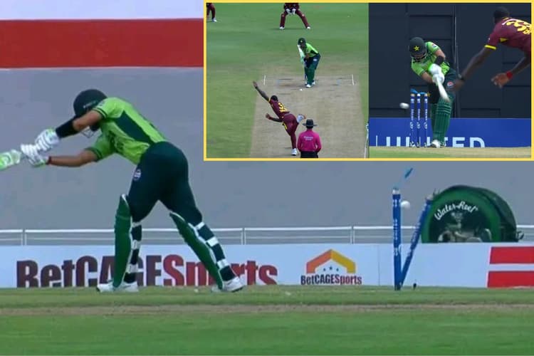 पाकिस्तान के स्टार बल्लेबाज और पूर्व ऑल-फॉर्मेट कप्तान बाबर आजम रविवार को वेस्टइंडीज के खिलाफ दूसरे वनडे में मोहम्मद रिजवान की अगुवाई वाली टीम के लिए नंबर तीन पर बल्लेबाजी करने उतरे, लेकिन वह खाता भी नहीं खोल पाए और तीन गेंद पर शून्य पर आउट हो गए. मैच के नौवें ओवर की आखिरी गेंद पर तेज गेंदबाज जेडन सील्स ने बाबर की डिफेंस भेदकर उनके स्टंप उखाड़ दिए. नंबर तीन पर उतरे बाबर दो गेंदों को डिफेंड करने के बाद तीसरी गेंद पर वह फुल लेंथ डिलीवरी को गलत लाइन में खेल बैठे और बोल्ड हो गए. (Babar Azam clean bowled on duck in WI vs PAK 2nd ODI video)