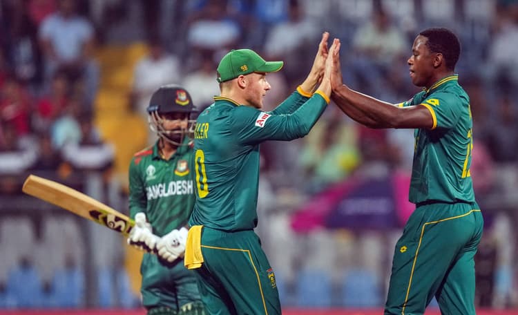 वर्ल्ड कप 2023 के 23वें मैच में दक्षिण अफ्रीका ने बांग्लादेश को 149 रनों से हरा दिया और टूर्नामेंट में चौथी दर्ज दर्ज की. दक्षिण अफ्रीका ने पहले खेलते हुए 50 ओवर में 5 विकेट के नुकसान पर 382 रनों का पहाड़ जैसा स्कोर खड़ा किया. फिर बांग्लादेश की टीम को 46.4 ओवर में केवल 233 रन पर ढेर कर दिया. दक्षिण अफ्रीका की ओर से डी कॉक ने 140 गेंदों में 174 रनों की विस्फोटक पारी खेली. जिसमें उन्होंने 15 चौके और 7 छक्के जमाए. इसके अलावा हेनरिक क्लासेन ने 49 गेंदों में 2 चौके और 8 छक्कों की मदद से 90 रनों की तूफानी पारी खेली. जबकि मार्कराम ने भी 60 रनों की ताबड़तोड़ पारी खेली इस मैच में रिकॉर्ड्स की झड़ी लग गई आइए देखें कौन-कौन से रिकॉर्ड्स बनें और टूटे.