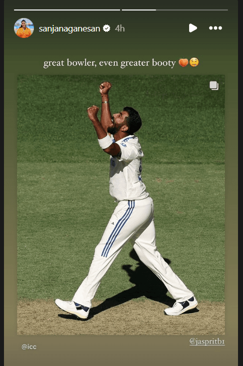 संजना गणेशन ने पर्थ टेस्ट के पहले दिन अपने पति जसप्रीत बुमराह के शानदार प्रदर्शन के बाद उनकी जमकर तारीफ की. बुमराह ने 4/17 का शानदार आंकड़ा पेश किया. बुमराह के प्रदर्शन से ऑस्ट्रेलिया 67/7 पर लड़खड़ा गया, जो अभी भी भारत से 83 रन पीछे है. पूरा क्रिकेट जगत बुमराह की गेंदबाजी की सराहना कर रहा है. हालांकि, उनकी पत्नी संजना ने अपनी सनसनीखेज इंस्टाग्राम स्टोरी के साथ बाजी मार ली. संजना ने बुमराह की तस्वीर के साथ कैप्शन में लिखा, “Great bowler, even greater booty,”